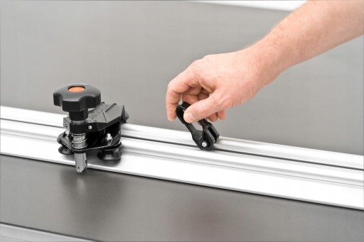 - Wózek tnący wykonany jest z odlewanego ciśnieniowo aluminium i porusza się na prowadnicy dzięki 3 kółkom z polioksymetylenu (materiał odporny na zużycie); każdy wyposażony w dwa wewnętrzne łożyska. Wyposażony jest w precyzyjne systemy regulacji (kalibrowane fabrycznie) umożliwiające stabilne połączenie zespołu tnącego z prowadnicą. Pozwala to zarówno na wyeliminowanie wszelkiego rodzaju luzów, jak i na prawidłowe ustawienie kółeczka tnącego względem prowadnicy, co zapewnia wydajność, precyzję jakość cięcia.