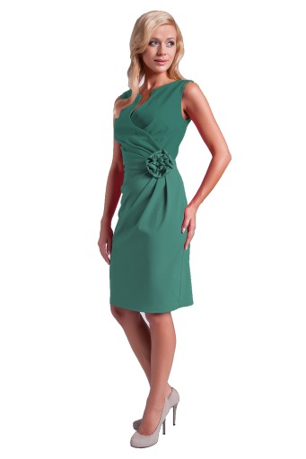 Piękna klasyczna sukienka z ozdobną różą. Zalety: Kopertowy dekolt -biust bardzo dobrze wygląda dopasowuje się do swoich wymiarów Efektowne zakładki w tali - niesamowity efekt a dla Pań o większych wymiarach pozytywnie tuszuje fałdki na brzuszku. Bardzo dobry materiał lekko elastyczny-poddaje się i jest wygodny w noszeniu. Ozdobna róża-efekt elegancji i oryginalności, ręcznie doszyta więc można ją odpruć bez śladu zyskamy nową kreację w bardziej klasycznym wydaniu.