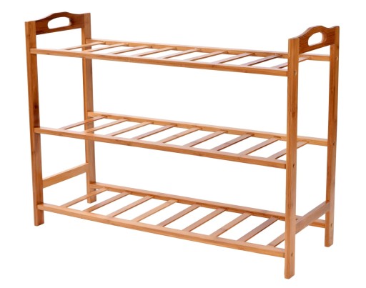 Trzypoziomowy regał na buty wykonany z lakierowanego drewna bambusowego. Pomieści około 9 - 10 par butów.
