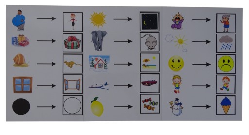 Pomoc terapeutyczna mająca na celu rozwijanie pamięci, koncentracji, logicznego myślenia. W zestawie znajdują się karty aktywności w formacie A4 oraz obrazki . Zadaniem dziecka jest dopasowanie odpowiedniego obrazka na zasadzie przeciwieństw np. słońce – deszcz.