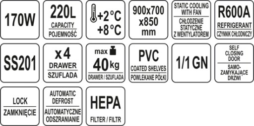 Stół chłodniczy o wymiarach 900x700x850mm ma pojemność komory 220L.