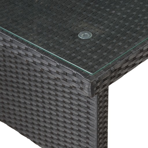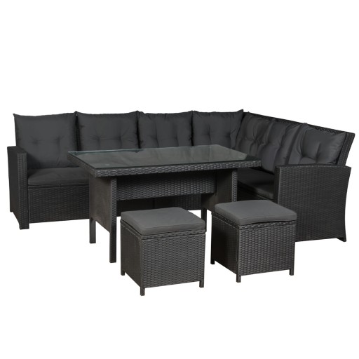 Dzięki polyrattanowemu narożnikowi ogrodowemu z czarnym oplotem, przekształcasz swoją przestrzeń na zewnątrz w stylowe miejsce do relaksu i odpoczynku. Wytrzymała konstrukcja stalowa i odporne na warunki atmosferyczne włókna z poli rattanu sprawiają, że meble ustawione na tarasie pod altaną czy w ogrodzie bardzo ładnie się prezentują. Duży stolik ze szklanym blatem służy jako miejsce do postawienia żywności i napojów. Grube poduszki siedziska i oparcia gwarantują trwały komfort. Wieczory towarzyskie z rodziną, przyjaciółmi lub sąsiadami będą wspaniałym relaksem na świeżym powietrzu.