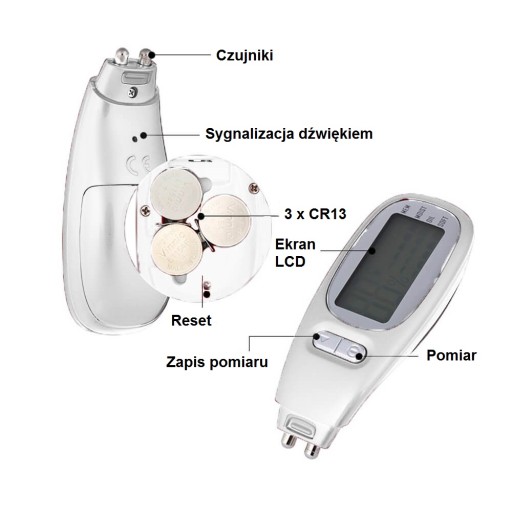 Pomiar jest szybki - trwa ok. 4 sekundy : wystarczy włączyć miernik i dotknąć sondą skóry następnie nacisnąć przycisk - „POMIAR” a po chwili zobaczyć stan 3 parametrów na wyświetlaczu.