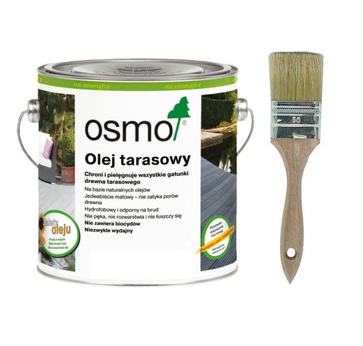 Ten nowoczesny olej do tarasów tworzy hydrofobową, mikroporowatą powłokę, która pozwala drewnu swobodnie oddychać, redukując pęcznienie i kurczenie się drewna. Dzięki temu nie pęka, nie łuszczy się ani nie odpryskuje (tak robią to wszystkie lakiery do drewna). Oleje tarasowe wygładzają powierzchnię drewna, pielęgnują je i zabezpieczają przed wnikaniem brudu i wody.Renowacja powierzchni pokrytej olejem tarasowym jest łatwa i szybka – nie wymaga szlifowania ani gruntowania przed aplikacją kolejnej warstwy, można też odnowić jedynie najbardziej zużyte fragmenty tarasu.Oleje do tarasów firmy Osmo są idealnie dopasowane do typowej barwy każdego z gatunków drewna, więc bez problemu pozwalają zachować, odnowić lub wyrównać naturalny kolor desek tarasowych. Zapewniają ochronę drewna przed szarzeniem pod wpływem promieni UV.Bezbarwny Olej tarasowy Teak (007) nie zawiera pigmentów i nie zapewnia ochrony UV. Jeżeli nie chcemy uzyskać na tarasie efektu naturalnej patyny, przed aplikacją oleju do tarasów należy pokryć drewno jedną z pigmentowych powłok Osmo.