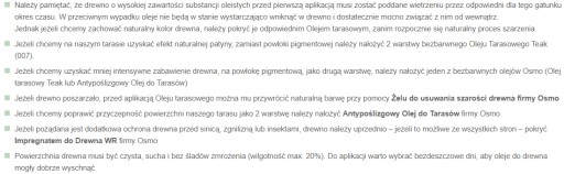 Ten nowoczesny olej do tarasów tworzy hydrofobową, mikroporowatą powłokę, która pozwala drewnu swobodnie oddychać, redukując pęcznienie i kurczenie się drewna. Dzięki temu nie pęka, nie łuszczy się ani nie odpryskuje (tak robią to wszystkie lakiery do drewna). Oleje tarasowe wygładzają powierzchnię drewna, pielęgnują je i zabezpieczają przed wnikaniem brudu i wody.Renowacja powierzchni pokrytej olejem tarasowym jest łatwa i szybka – nie wymaga szlifowania ani gruntowania przed aplikacją kolejnej warstwy, można też odnowić jedynie najbardziej zużyte fragmenty tarasu.Oleje do tarasów firmy Osmo są idealnie dopasowane do typowej barwy każdego z gatunków drewna, więc bez problemu pozwalają zachować, odnowić lub wyrównać naturalny kolor desek tarasowych. Zapewniają ochronę drewna przed szarzeniem pod wpływem promieni UV.Bezbarwny Olej tarasowy Teak (007) nie zawiera pigmentów i nie zapewnia ochrony UV. Jeżeli nie chcemy uzyskać na tarasie efektu naturalnej patyny, przed aplikacją oleju do tarasów należy pokryć drewno jedną z pigmentowych powłok Osmo.