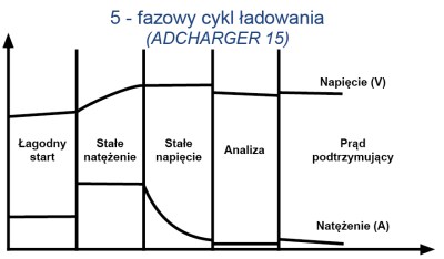 Inwertorowy prostownik AD CHARGER 15 to nowoczesne, elektroniczne urządzenie do ładowania akumulatorów wszystkich typów. Charakteryzuje się wysoką jakością wykonania i niezawodnością. Ergonomiczna, kompaktowa obudowa oraz niska waga powodują, że ładowarkę AD CHARGER 15 można mieć zawsze przy sobie, np. w bagażniku samochodu. Obudowa urządzenia zgodnie z normą PN-EN 60529:2003 spełnia warunki klasy ochrony IP20. AD CHARGER 15 ładuje napięciem 12V, posiada zaawansowany panel dotykowy z cyfrowym wyświetlaczem, pozwalający na ustawienie wielu parametrów ładowania i podgląd aktualnego stanu naładowania akumulatora. Mikroprocesorowe sterowanie procesem ładowania i zastosowanie 5-fazowego cyklu ładowania pozwala na bardzo długie pozostawienie akumulatora podłączonego do urządzenia bez ryzyka jego uszkodzenia. Model AD CHARGER 15 to nasz najmocniejszy prostownik elektroniczny pozwalający na ładowanie akumulatorów motocyklowych, samochodowych, łodzi, ciężarówek z instalacjami 12V.