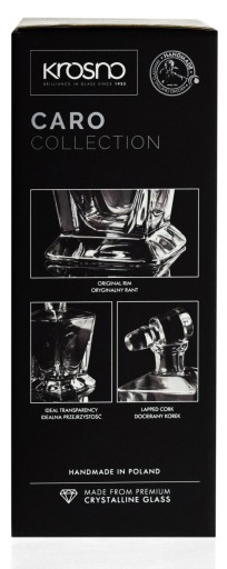Karafka sygnowana jest logo producenta w formie naklejki którą w łatwy sposób można usunąć oraz subtelnym grawerem laserowym KROSNO HANDMADE na spodzie produktu.