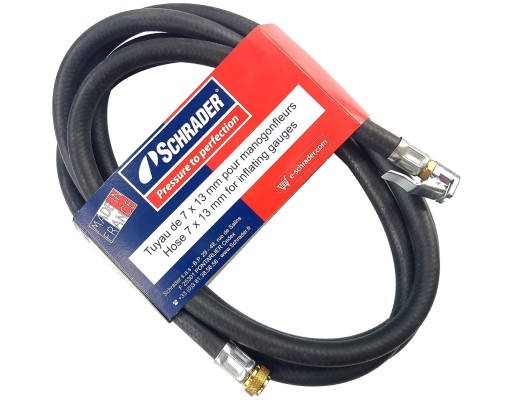 - Oryginalny, zbrojony przewód gumowy, taki sam, w jaki wyposażane są fabrycznie, pistolety do pompowania kół SCHRADER MAESTRO.