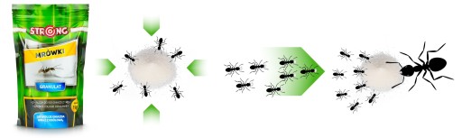 Pierwszym krokiem jest zidentyfikowanie szlaków komunikacyjnych, którymi poruszają się mrówki. Po indentyfikacji miejsc, rozsyp niewielką ilość preparatu STRONG (dobrze jest skorzystać z tacki lub wieczka od słoików) w obszarach, gdzie mrówki się gromadzą. Aby zagwarantować, że mrówki spożywają wyłącznie trutkę, zaleca się oczyszczenie obszaru z innych źródeł pożywienia. Mrówki przenosząc granulat do gniazda, przyczynią się do jego likwidacji w około 15 dni od momentu zastosowania.