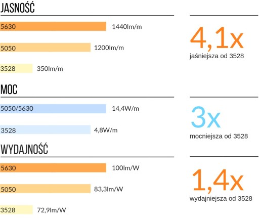 Większa wydajność oznacza, że przy tej samej mocy taśma świeci jaśniej, ponieważ większa część mocy elektrycznej jest przetwarzana na światło, a nie na wydzielane ciepło. Dzięki temu otrzymujemy jaśniej świecącą taśmę przy tej samej mocy elektrycznej oraz taśmę która mniej się grzeje.
