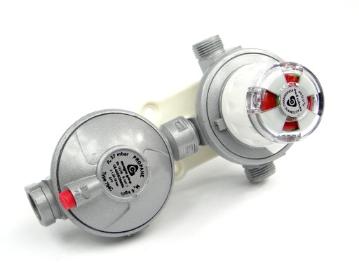 Reduktor automatyczny gazu propan, przeznaczony do zasilania instalacji przydomowych, gastronomicznych i przemysłowych. Do reduktora można podłączyć zestaw 2-4-6-8 butli 33 kg. W reduktorze tym przełącznik poboru gazu wyposażony jest w zawory zwrotne co zabezpiecza przed ulatnianiem gazu z instalacji podczas wymiany butli. Strzałka na zaworze przełączającym oraz zielony kolor wskaźnika informuje, że gaz jest pobierany z butli wskazywanej aktualnie przez strzałkę. Druga butla zaworu przełączającego jest rezerwowa. Gaz jest pobierany z butli dopóki ciśnienie nie spadnie poniżej 0,8 bar. Przy tej wartości ciśnienia zawór przełączający automatycznie otwiera wejście zaworu z butli rezerwowej [aby prawidłowo działał reduktor konieczne jest otwarcie zaworów wszystkich butli] Gdy przełącznik działa, wskaźnik zmienia z zielonego na czerwony, wskazując, że butla z której był poprzednio pobierany gaz jest pusta. Pokrętło na przełączniku należy ustawić wskaźnikiem w kierunku aktualnie czynnej butli. W tym momencie barwa wskaźnika zmienia się z czerwonej na zieloną. Aby wymienić pustą butlę należy zamknąć zawór i odłączyć od niej końcówkę węża a następnie przykręcić tę końcówkę do pełnej butli. Do każdego reduktora załączane są przepisy -dokładna instrukcja obsługi instalacji i bezpieczeństwa.