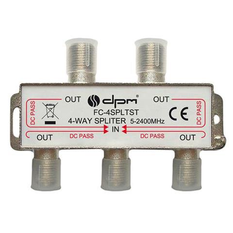 Splitter - rozdzielacz sygnału telewizyjnego z anteny DVB-T lub satelitarnej na 4 odbiorniki. 1 wejście typu F. 4 wyjścia typu F. Przystosowany do anten ze wzmacniaczami - przesył napięcia z zasilacza antenowego. Zakres częstotliwości: 5-2400 MHz. Obudowa metalowa.