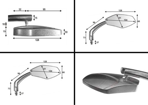 Są to lusterka uniwersalne. Nadają się do wszystkich motocykli posiadających mocowanie na śrubę M10 z gwintem prawostronnym z obu stron. Głowa i nóżka lusterka wykonana są z wytrzymałego tworzywa, przegub i mocowanie ze stali. Całe lusterko pokryte jest grubą warstwą srebrnej farby.