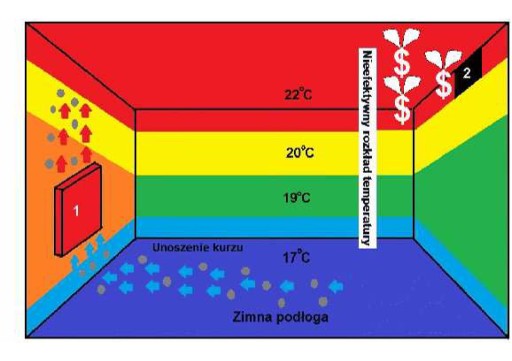 Grzejnik konwekcyjny generuje ruch powietrza „od podłogi w kierunku sufitu” co objawia się w postaci „komina termalnego”, który jest niczym innym jak tylko smugą gorącego powietrza. Ten sposób ogrzewania wymusza lokalizację źródeł ciepła właśnie w pobliżu okien gdzie znajdują się nawiewniki, którymi do pomieszczenia dostaje się „świeże, zimne powietrza”. Tak naprawdę więc ogrzewamy i dodatkowo wysuszamy powietrze, które następnie przecież i tak „ucieka” systemem wentylacji do otoczenia. Poza tym w pomieszczeniu obserwowany jest efekt stratyfikacji czyli uwarstwienia temperaturowego. Mamy więc do czynienia z relatywnie „zimną podłogą” (mającą najczęściej temperaturę poniżej temperatury komfortu tj.18°C) oraz gorąca strefę „podsufitową”. Taki rozkład temperatury jest niekorzystny również z punktu widzenia fizjologii ludzkiego ciała. Najbardziej ukrwione, czyli najcieplejsze jego części znajdują się w okolicach serca. Przede wszystkim zaś kończyny dolne i górne to miejsca o najniższej temperaturze. Sytuacja ta potęguje więc uczucie chłodu.
