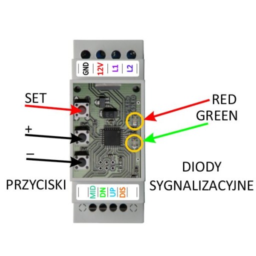 Zestaw jest przeznaczony do automatyki oświetlenia LED schodów w instalacjach z równoległym połączeniem lamp. Lampy mogą być połączone w 1 lub 2 grupy o różnym obciążeniu prądowym 8A (L1) i 2A (L2) i pracować w jednym z 3 trybów (o tym poniżej). Na działanie sterownika można w znacznym stopniu wpływać poprzez zmianę parametrów konfiguracyjnych.