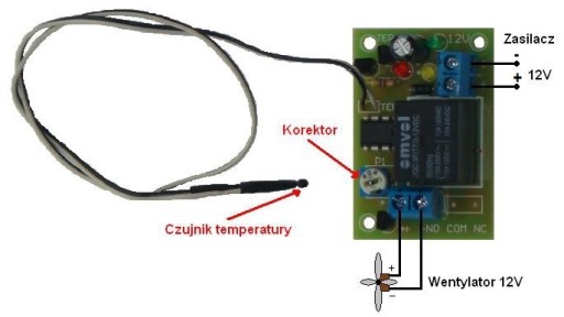 - termostat posiada 3 diody: zielona - zasilanie, zółta - temperatura powyżej 30C (start wentylatora), czerwona - temperatura powyżej 75C (awaryjne wyłączenie)