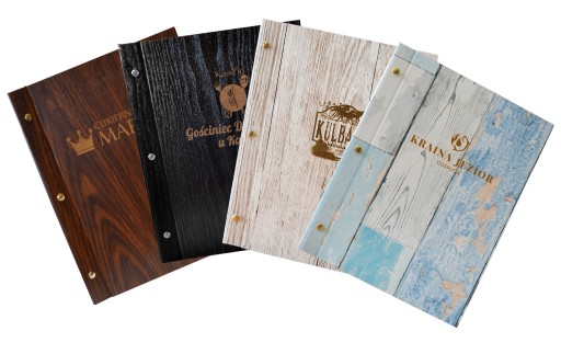 - okładka menu wykonana z twardego materiału, imitującego okleinę meblową,