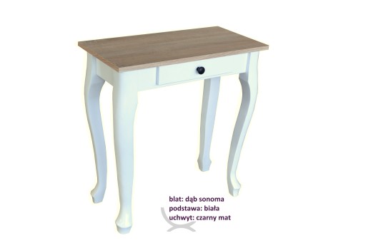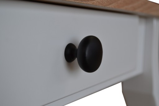 Rama, szuflada oraz nogi to lite drewno bukowe, blat wykonany z płyty laminat. Uchwyt czarny mat.