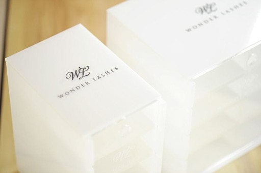 Elegancki pojemnik wykonany z białej plexi. Służy do przechowywania rzęs. Wyposażony w 8 holderów o wymiarach 8,5 cm x 13 cm (grubość 0,5 cm).