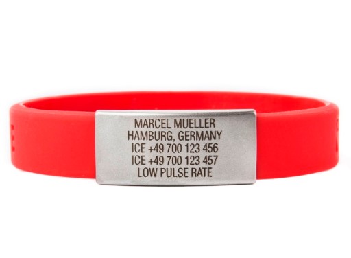 Na opasce Slim możesz umieścić wszystkie swoje najważniejsze dane, które mogą przydać się w krytycznej chwili. Zostaną one wygrawerowane laserowo na identyfikatorze ze stali nierdzewnej, dlatego są niezwykle trwałe. Dostępnych jest 6 kolorów opaski Slim.