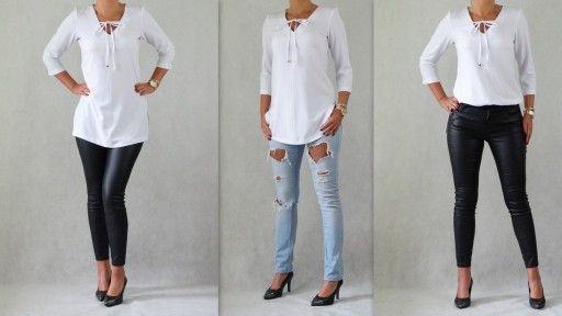 BARDZO ELEGANCKA TUNIKA W KOLORZE BIAŁYM ,NOWOCZESNY LOOK W POSTACI WIĄZANIA PRZY DEKOLCIE A'LA CHOKER ZAKONCZONY ZŁOTYMI ZACISKAMI,PO BOKACH ROZPORKI