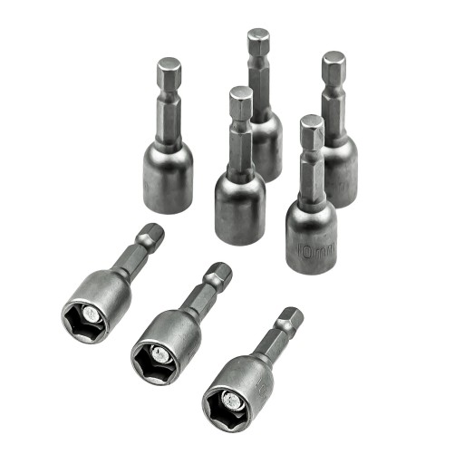 Nasadki są wykonane z wysokiej jakości stali narzędziowej, chromowo wanadowej CrV. Posiadają mocowanie sześciokątne o przekroju 1/4". Bardzo mocny magnes został wprasowany w nasadkę, co podnosi trwałość produktu oraz gwarantuje pewne trzymanie śrub.