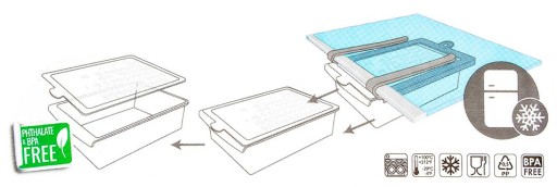 Lekki, zarazem solidny pojemnik do lodówki w formie organizera lub szufladki. Łatwy w utrzymaniu czystości; można myć w zmywarce. Wyposażony w uchwyty wraz z przyssawką umożliwiające stabilne mocowanie nie tylko w lodówce.