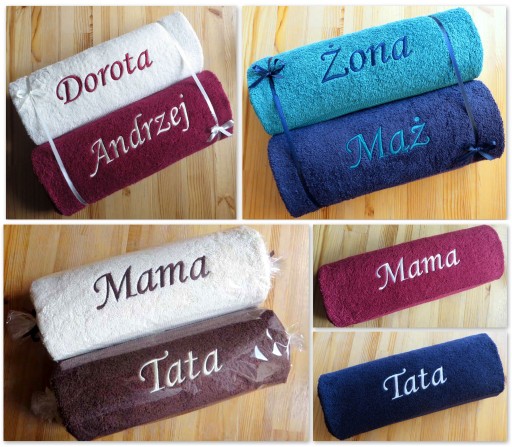 Ta aukcja i cena dotyczą kompletu 2 szt. ręczników 70x140 cm w KOSZU, z Twoim haftem w postaci imienia lub dowolnego 1 SŁOWA (bez grafiki).