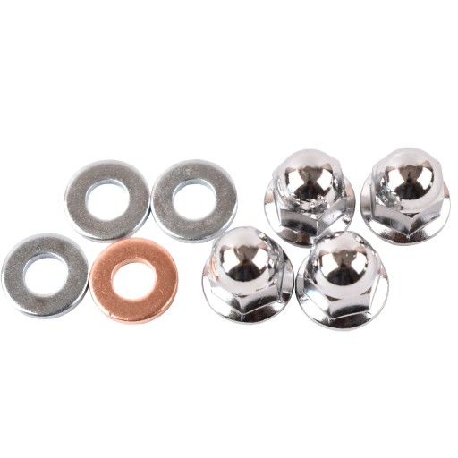 Komplet zawiera 4szt nakrętek chromowanych M6 zamkniętych oraz 4szt podkładek w tym podkładkę miedzianą do kanału olejowego