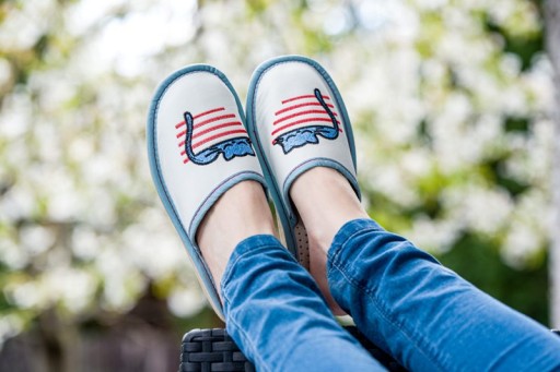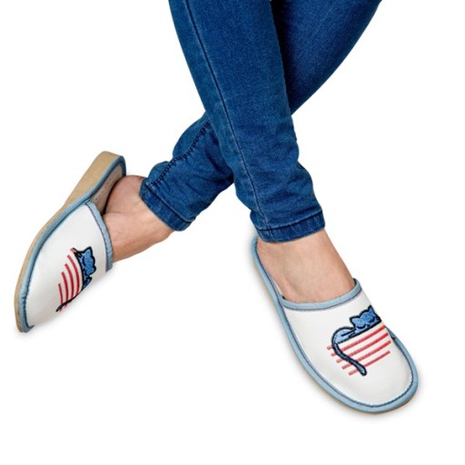 - Pantofle ozdobione są uroczym haftem w kształcie śpiącego kotka,