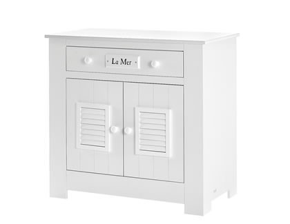 Komoda Marsylia MDF wyposażone jest w dekor z napisem La Mer (fr. morze) dzięki czemu stanowi jeden z elementów kolekcji