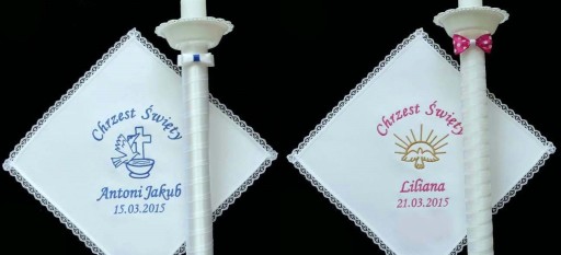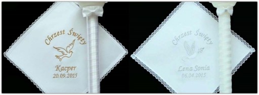 haftowane pamiątki Chrztu (ramki, poduszki, ręczniki).