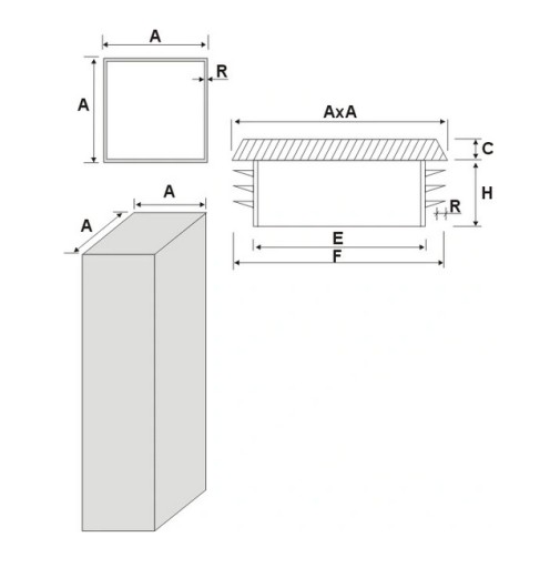Zaślepki kwadratowe wykonane z tworzywa sztucznego metodą wtrysku, przeznaczone do zaślepiania profili. Zaślepka zbudowana jest z części zewnętrznej wystającej poza profil oraz z części wewnętrznej tzw. rdzenia, wbijanego w środek profila. Matowa struktura górnej części zaślepki nadaje jej estetyczny wygląd. Chropowata powierzchnia zapobiega zarysowaniom w opakowaniach zbiorczych. Dolna część zaślepki składa się z rdzenia oraz wystających „lamelek”. Podczas wbijania zaślepki, lamelki dopasowują się do grubości ścianki profila.