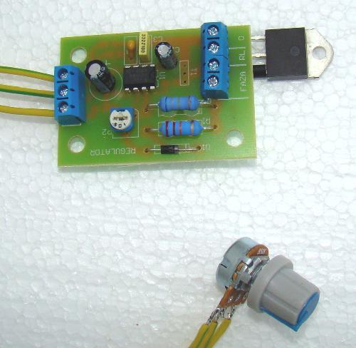 Sterownik oparty o specjalistyczny układ scalony U2008 i triak o pradzie 25A (max chwilowo do 40A) z sieci 230V. Regulator posiada potencjometr na przewodzie (łatwy montaż) oraz gałkę potencjometru w komplecie.