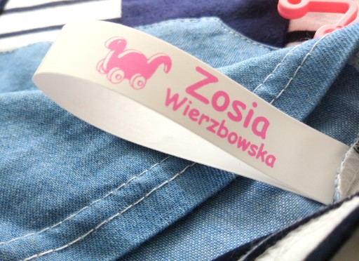 ... z imieniem i nazwiskiem lub tylko imieniem Twojego dziecka wykonane są z taśmy nylonowej, wytrzymałej posiadają niestrzępiące boki oraz wodoodporny nadruk, który nigdy się nie spierze :)