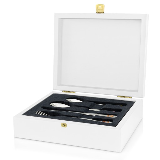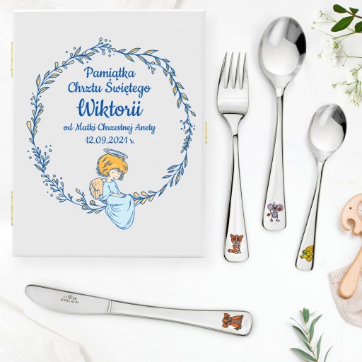 Szukasz wyjątkowego prezentu dla chrześniaka lub chrześnicy z okazji Chrztu Świętego bądź pierwszych urodzin, który pomoże mu w nauce samodzielnego jedzenia i jednocześnie będzie wyjątkową pamiątką? Jeśli tak to mamy do zaoferowania nietuzinkowy komplet sztućców zapakowany w drewnianą szkatułkę, dodatkowo na szkatułce wykonamy spersonalizowany kolorowy nadruk. Na każdym sztućcu zostanie wykonany indywidualny grawer.