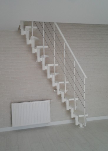 12-elementowy zestaw schodów modułowych, wykonanych z litego drewna o kolorze farba biały mat lub do wyboru z palety kolorów oraz stali o białym macie wykończeniu. Zestaw można złożyć samodzielnie w ramach 13 poziomów bądź zamówić usługę montażu, którą wykonuje producent.