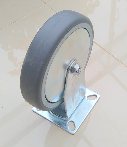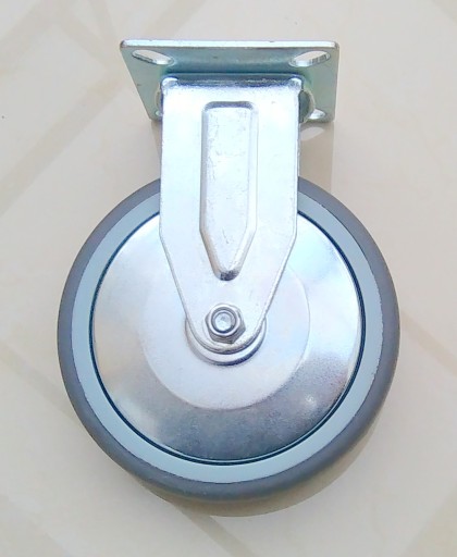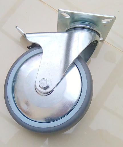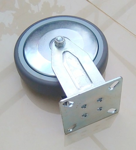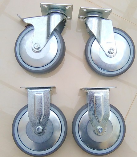 Oferuję Państwu koła wysokiej jakości produkcji amerykańskiej. Koła mocowane na płytkę są połączeniem widelca aparaturowego wykonanego ze stali ocynkowanej oraz koła polipropylenowego z szarym bieżnikiem z gumy termoplastycznej niebrudzącej. Hamulec blokuje koło i głowicę (płytkę)