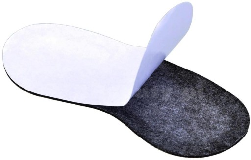 - Spód wkładek pokryty jest warstwą kleju, zabezpieczoną plastrem, która pozwala na pewne przymocowanie produktu wewnątrz obuwia.
