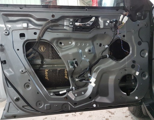 - Maty butylowe naklejamy na niedużą zakładkę. Omijamy miejsca montażowe na śruby, a wiązki elektryczne wyciągamy na zewnątrz