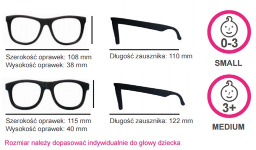 Okulary w rozmiarze M przeznaczone dla dzieci od 3 roku życia.