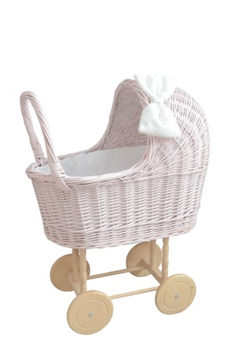 Wózek wiklinowy dla lalek kolor różowy.