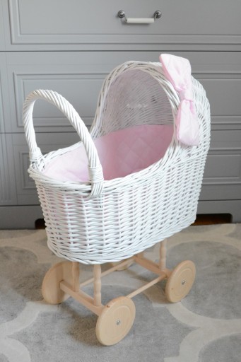 Śliczny i niepowtarzalny wózek dla lalek z piękną pikowaną kokardką.