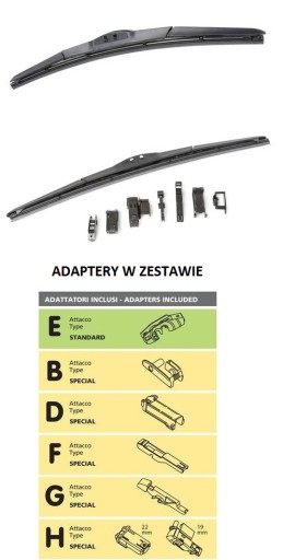 Wycieraczki posiadają całkowicie osłonięte pióro, zintegrowane z ramieniem i łączą wyrafinowaną konstrukcję z dyskretną stylistyką. Szkielet umieszczony w obudowie wycieraczki gwarantuje doskonałe przyleganie do powierzchni szyby, natomiast sztywne gumowe pióro z grafitową powłoką zapewnia gładkie i bardziej skuteczne wycieranie.Zestaw wyposażony w adaptery umożliwiające montaż wycieraczek w prawie każdym aucie dostępnym na rynku.