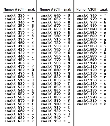 Opis każdego czujnika składa się z 13 znaków gdzie każdy może być małą / wielką literą, cyfrą, spacją czy znakiem specjalnym. Dokładnie sterownik korzysta z typowego komputerowego zestawu znaków ASCII od numeru 32 do 122 czyli jak w tabeli poniżej.