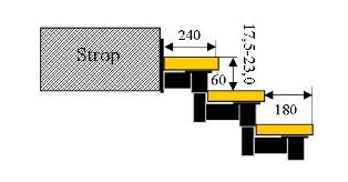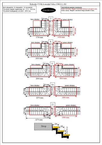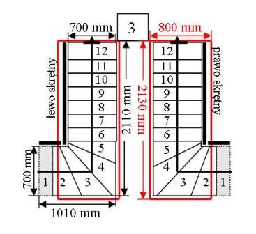 Zabieg schodów: prosto (P), z zabiegiem (L-90) lewoskrętny, prawoskrętny