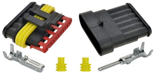 Złącze stosowane w motoryzacji w bardzo szerokim zakresie. W zestawie kostka męska i żeńska, komplet konektorów i uszczelnień.