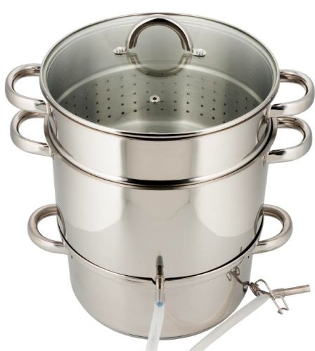 Nowy sokownik pochodzący z renomowanej fabryki wykonany ze stali nierdzewnej o całkowitej pojemności 11 L , którego średnica podstawy dna wynosi 17,5cm, wysokość całkowita przy zdjętej pokrywce 27cm, wysokość pokrywki 5,5cm.