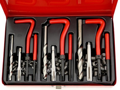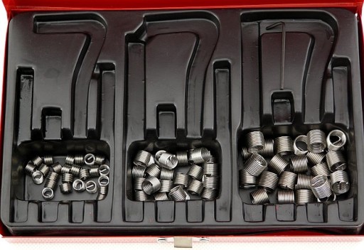 Zestaw przeznaczony jest do naprawy uszkodzonych gwintów M6 / M8 / M10. Wiertła i gwintowniki wykonane zostały ze stali szybkotnącej HSS4341. Gwintowniki jednostopniowe, nacinają gwint, w który wprowadza się wkładkę spiralną z twardej stali nierdzewnej. Do wprowadzenia wkładki służy pokrętło prowadzące, oraz wybijak, który obłamuje wystającą końcówkę wkładki.