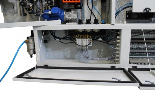- Agregat górnego i dolnego frezowania z pionową i poziomą regulacją na dwóch silnikach (mocowane na łożyskach liniowych) HF 200 Hz, 12000 obr./min. i głowicami frezującymi 75, Z=4; 15, R2 lub R3 mm (opcjonalnie).